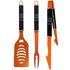 This Auburn Tigers 3 pc Color and Black BBQ Set is an ideal grilling accessory. The eye-catching black and chrome graphics on this set make it a game day favorite! The high-quality, 3 pc Auburn Tigers BBQ grill set will make any grill master smile. These barbeque tools are made to last whether you are using them for camping, tailgating or a patio party you will have quality grill tools for years to come. The set includes a large spatula with a bottle opener feature and sharp serrated edge, strong tongs and fork all in a team color finish with black team logos. The 17 inch length keeps you far from the flames. The quality of the tools make them a great choice for Father's Day or Christmas gifts, they are really a grill accessory must have. Features:
