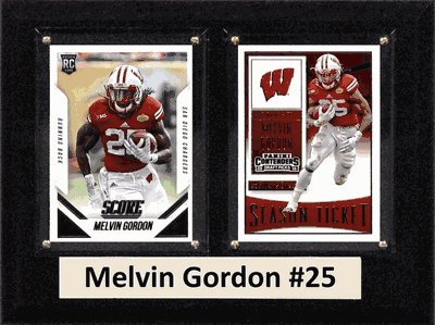 Melvin Gordon is celebrated on a 6"X8" cherry wood plaque featuring an NCAA-licensed trading card and an engraved nameplate. Superior, high-clarity acrylic lens covers firmly affixed to the plaque with brass-type screws protect the trading card. The polished look makes for a well-crafted, long-lasting piece perfect for displaying in an office, recreation room, or any spot for a fan to enjoy. It is proudly produced and assembled in the USA. Availability: This item ships in approximately 5-7 business days. Manufactured by C&I Collectibles. Please note: Trading cards featured may vary depending upon stock availability. Plaque will always feature the player featured, but may be from a different year or trading card manufacturer. | |||||||||