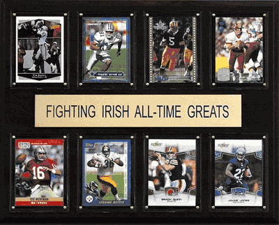 Eight of the greatest Notre Dame Fighting Irish stars are featured on this 12"x15" cherry wood plaque. The players are presented on genuine licensed trading cards from different manufacturers making this a perfect piece to display in an office, recreation room, or any spot for a fan to enjoy. The cards are protected by superior high-clarity acrylic lens covers and firmly affixed to the plaque with brass-type screws for a polished look. All cards are easily replaceable with ones from your own collection. This long-lasting piece is proudly produced in the USA. Availability: This item ships in approximately 5-7 business days. Manufactured by C&I Collectibles. Please note: Trading cards featured may vary depending upon stock availability. Plaque will always feature the player featured, but may be from a different year or trading card manufacturer. | |||||||||