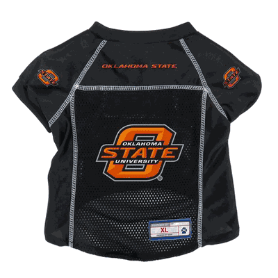 The Oklahoma State Cowboys Pet Jersey features full color team graphics on the back and sleeves and an NFL shield on the front. Comes in 8 fashion colors. The Pet Jersey comes on a hanger ready to display. Woven NFL Shield. Dazzle V-Neck Collar. Full color team logo and sleeve decoration. Woven Jock Tag and locker tag. Made by Little Earth.